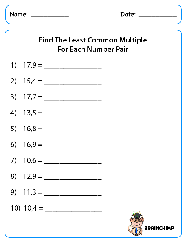 The lowest common multiple of two numbers is the smallest number that is a multiple of both numbers. Least common multiple (lcm) worksheets. Some of the worksheets for this concept are finding the least common multiple of two numbers lcd 1, finding the lcd of two fractions work 3, rational expressions, name date exercises finding a common denominator lcd 1, least common multiple lowest common denominator and, math 67 notes unit 2 preview name.